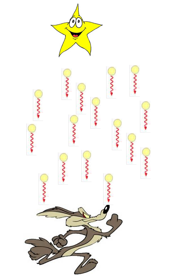 Actually, that’s how it looks like for a side and stationary observer. What would you (in case you are not a coyote, feel free to replace the picture with your favorite representation of yourself. I don’t know who’s reading this, so I had to make some assumptions…)… what was I saying? Oh yes: what would you see, when you’re moving really fast (in reality you are not moving that fast, it’s the earth moving, of course), according to aberration proponents, would be something like this: